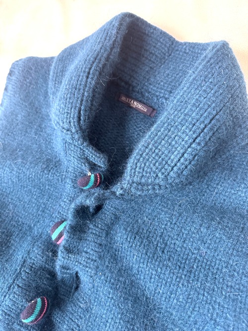 極太アルパカウールのニットベスト。折り返しのないダブルに編んだ立体の襟。サイドにもスラッシュポケットが付くWポケット。フロントにボーダーを編み込んだクルミボタン。 バルキーな編み地と至福の肌触りのニットベスト。ラスト1. Size F 身幅 57cm 着丈 66cm Color NAVY, SMOKY BLUE material 表地 ベビーアルパカ 50% ウール 50% made in japan