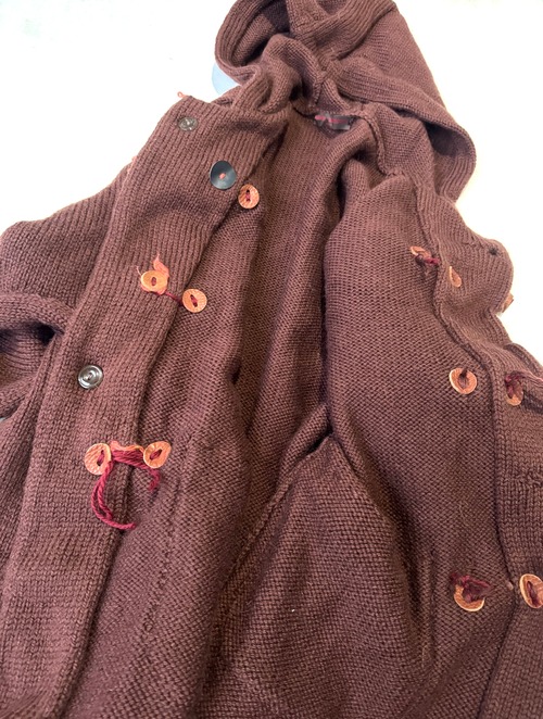 Brand SHINYA NOMOTO Detail 1996年頃 母のニット家庭用編み機によるニットコート作品。 極極太毛糸の縄ひもとバッファーローショルダーレザートッグル, 袖のカーブが特徴のダッフルニットコート。今では製作不可能な初期のハンドメイド作品。 デッドストック Color BROWN Material Wool 100% Size 身幅70cm 着丈86cm 裄丈107cm(カーブにそって) HAND MADE by MY MOTHER