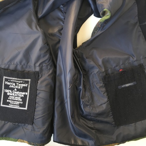 Detail ヴィンテージハリスツイードジャケットを野本自身で分解、裁断し 3種類のハリスツイードでダイヤ柄パッチワークを組み上げました。