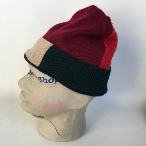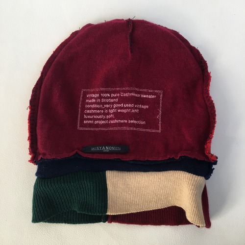 Brand SHINYA NOMOTO Detail ビンテージ カシミア セーターを素材とし裁断,リブニットを組み合わせたニットキャップ。ワンオフ製作 size F 縦27cm x 横23.5cm Color burgundy x red リブ burgundy green navy beige Material cashmere 100% Hand made by Shinya Nomoto