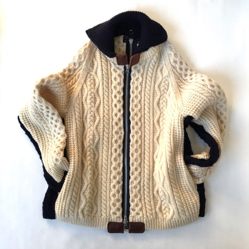 Detail ビンテージ フィシャーマン クルーネックセーターの収集 選択 x 襟 手編みケーブルパーツ,サイドポケット,レザーパーツをハンドメイドで新たに製作 。CONMARファスナーが前後に付く1点モノ。
